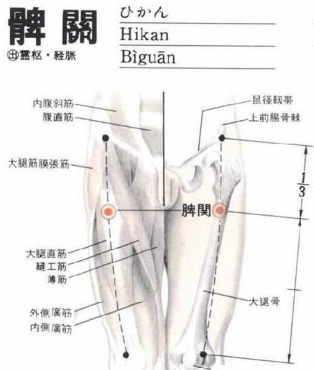髀关穴,出《灵枢.经脉》。属足阳明胃经。在大腿前面,当髂前上棘与髌底外侧端的连线上,屈股时,平会阴,居缝匠肌外侧凹陷处。布有股外侧皮神经与旋股外侧动、静脉分支。主治膝、髋、股、膝痛,下肢屈伸不利、麻痹、瘫痪,及股外侧皮神经炎等。直刺1-1.5寸。艾炷灸3-5壮;或艾条灸5-10分钟。”