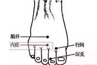 陷谷,经穴名。出《灵枢.本输》。属足阳明胃经。别名陷骨。输(木)穴。在足背,当第2、3跖骨结合部前方凹陷处。布有足背内侧皮神经和足背静脉网。主治腹痛胀满,肠鸣泄痢,面目浮肿,目赤痛,疝气,足背肿痛等。直刺0.5-1寸。艾炷灸3-5壮;或艾条灸5-10分钟。