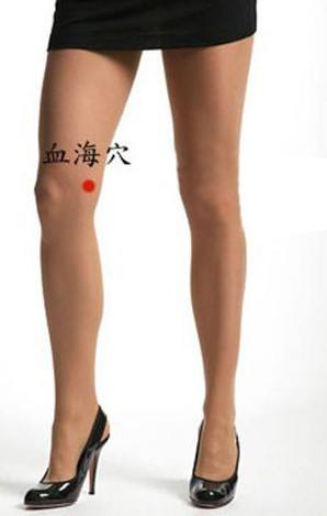 血海穴,血这里指脾血,海,指脾经所生之血在此聚集,气血物质充斥的范围巨大如海,故名。该穴有化血为气,运化脾血之功能,为人体足太阴脾经上的重要穴道之一。取该穴时应屈膝,在大腿内侧,髌底内侧端上2寸,当股四头肌内侧头的隆起处。或患者屈膝,医者以左手掌心按于患者右膝髌骨上缘,二至五指向上伸直,拇指约呈45度斜置,拇指尖下是穴。最好每天9-11点在脾经经气最旺盛时按揉该穴,美侧按揉3分钟,以酸胀为度。