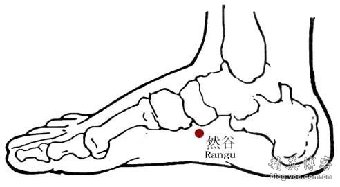 然谷,经穴名。出《灵枢.本输》。别名龙渊,然骨。属足少阴肾经。荥(火)穴。在足内侧缘,足舟骨粗隆下方,赤白肉际。布有小腿内侧皮神经末支及足底内侧神经,足底内侧动脉及跗内侧动脉分支。主治喉痹,咳血,消渴,阴痒,阴挺,月经不调,阴痿,遗精,脐风口噤,足跗肿痛等。直刺0.5-1寸。艾炷灸3壮;或艾条灸5-10分钟。